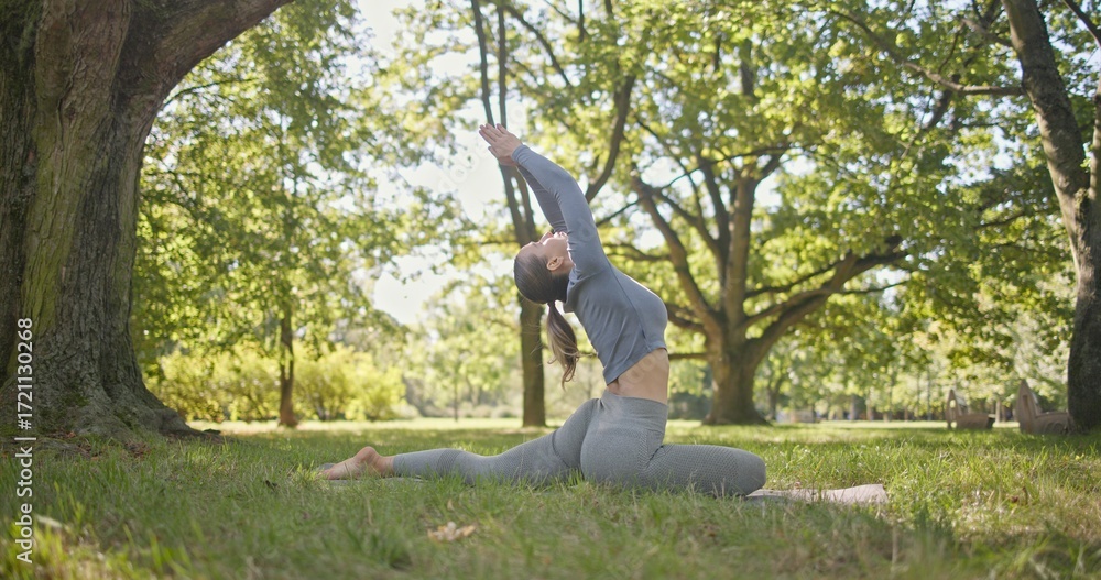 young beautiful white girl doing yoga in park among trees in clearing on summer day