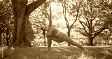 young beautiful white girl doing yoga in park among trees in clearing on summer day