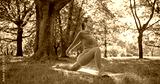 young beautiful white girl doing yoga in park among trees in clearing on summer day