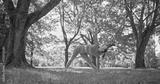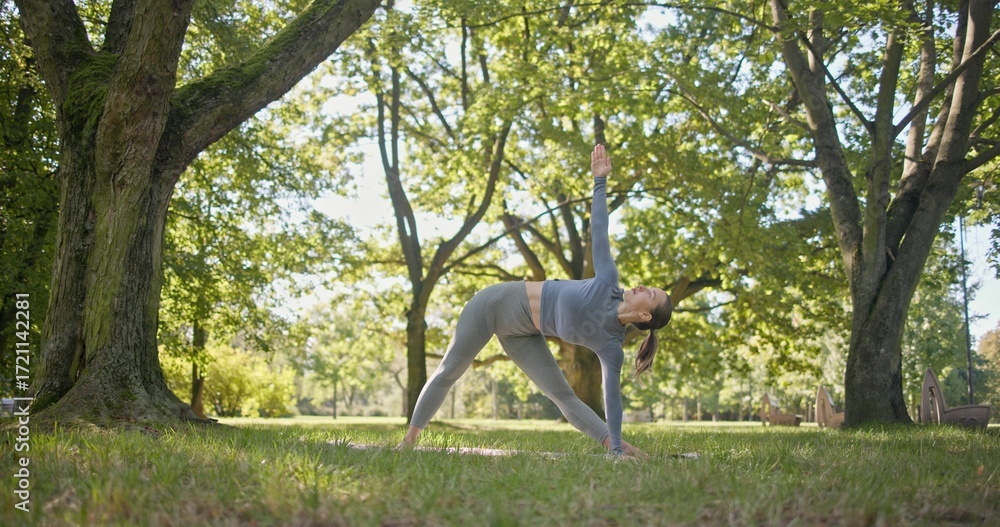 young beautiful white girl doing yoga in park among trees in clearing on summer day