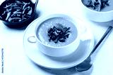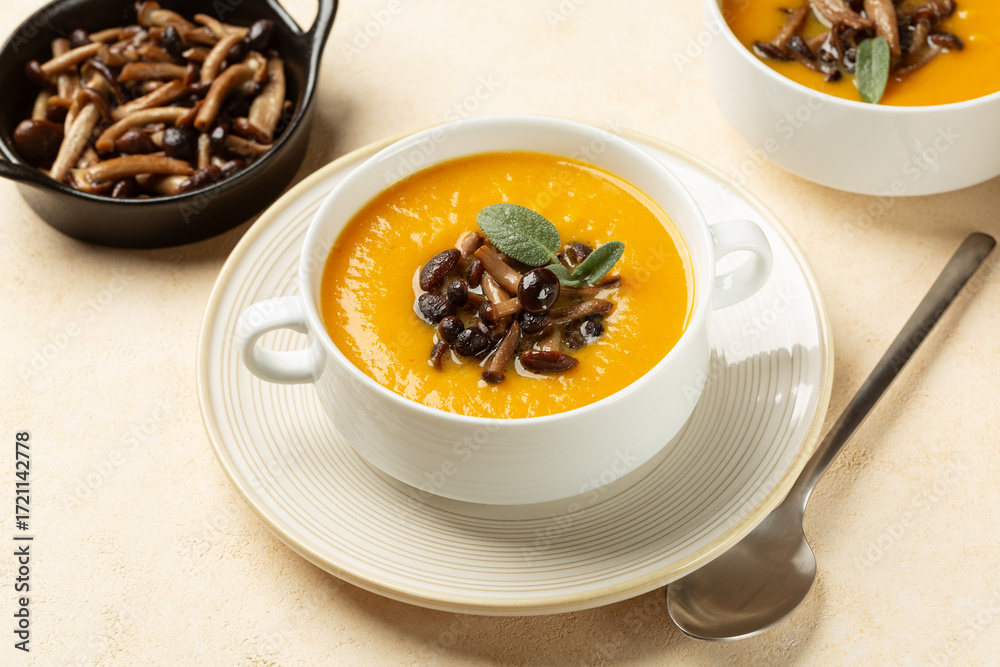 Homemade vegan soup with pumpkin and sauuteed honey fungus or Chiodino edible mushrooms in a white bowl. Autumn meal.