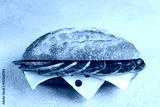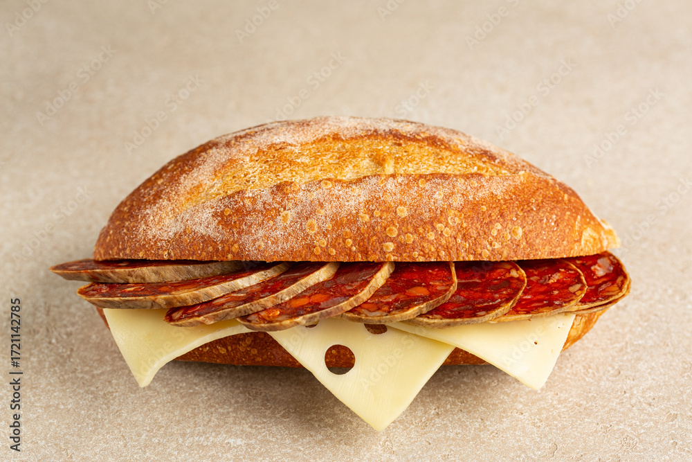 Sandwich with sliced Iberian chorizo, is a sausage, salami made with Iberian pork and paprika, emmental cheese. Beige background.