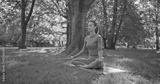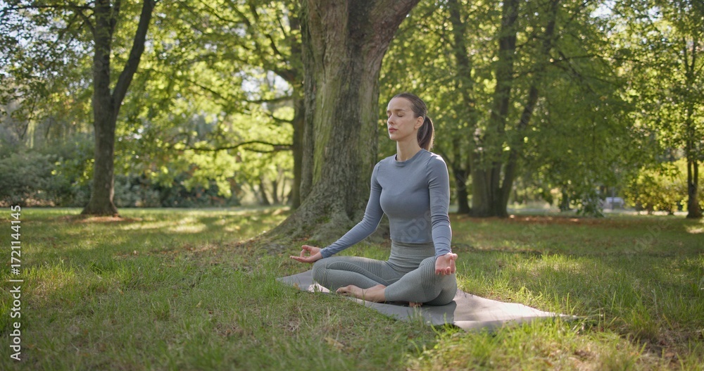 A young beautiful white girl practices yoga in the park and meditates in the lotus position among the trees in a clearing on a summer day
