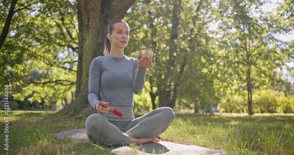 A young beautiful white girl doing yoga in the park and meditating in the lotus position among the trees in a clearing on a summer day and using a singing brass bowl