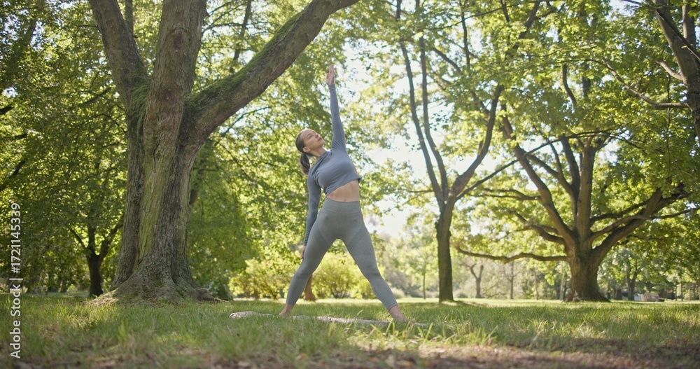 young beautiful white girl doing yoga in park among trees in clearing on summer day