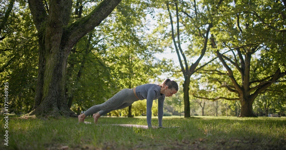 young beautiful white girl doing yoga in park among trees in clearing on summer day