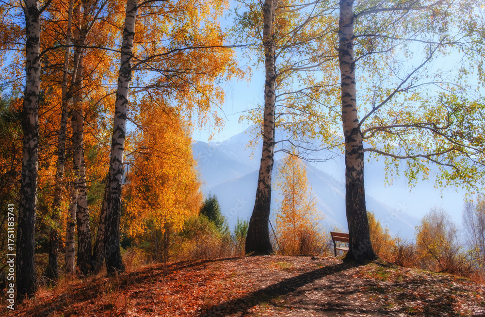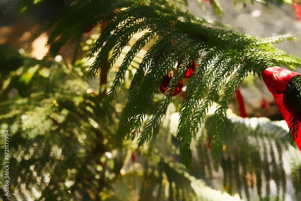 Christmas background with soft blurred tree and red ribbon during sunny day. Close-up Christmas tree decoration. Concept of natural light, merry, holidays, cozy, warm, winter for poster, wallpaper.