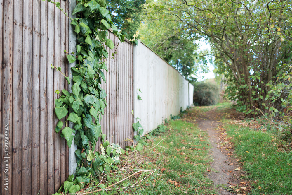 Tall creeper plant seen growing down a rear wooden garden fence. A rear public footpath can be seen running along the rear gardens.