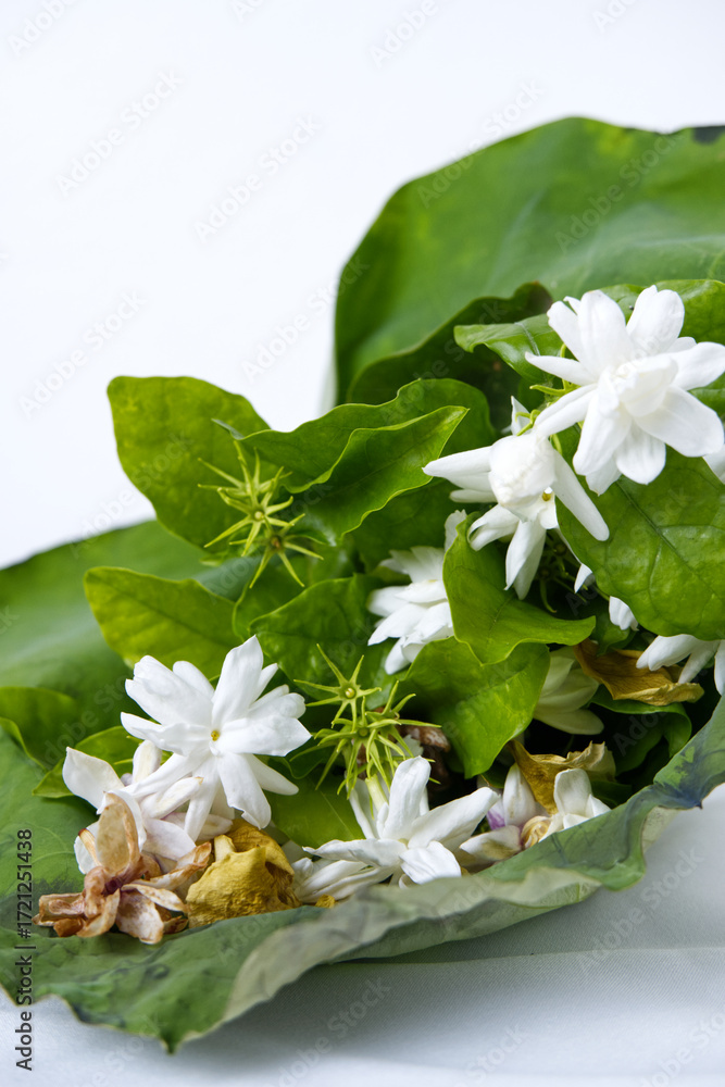 Jasmine flower wrapped in big green leaf placed on white tablecloth. Vertical image of white jasmine flower. Concept of decor, fragrant, cozy, innocence, plant, leaves for background, print.