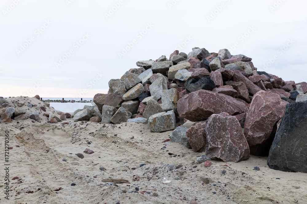 Construction work on the Baltic Sea. A pile of large stones. Breakwaters.