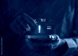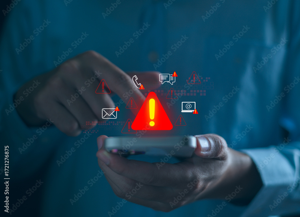 Businessman using computer with system warning alerts, Concept of cyber threat, phishing, scam messages, suspicious calls, and online security risks on communication.