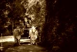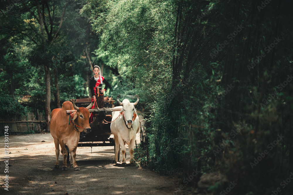Woman Riding Cart Pulled by Oxen Through Lush Green Forest Path