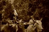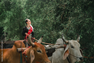 Traditional Woman with Cattle in Lush Green Forest Setting