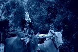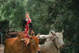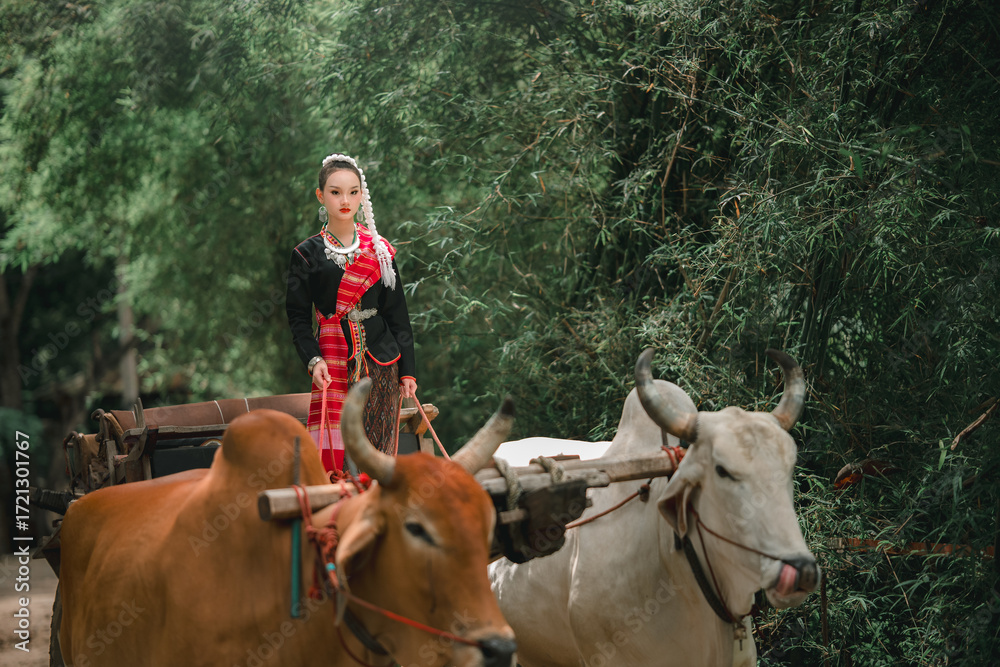 Young Woman in Traditional Attire with Oxen in Rustic Landscape