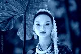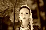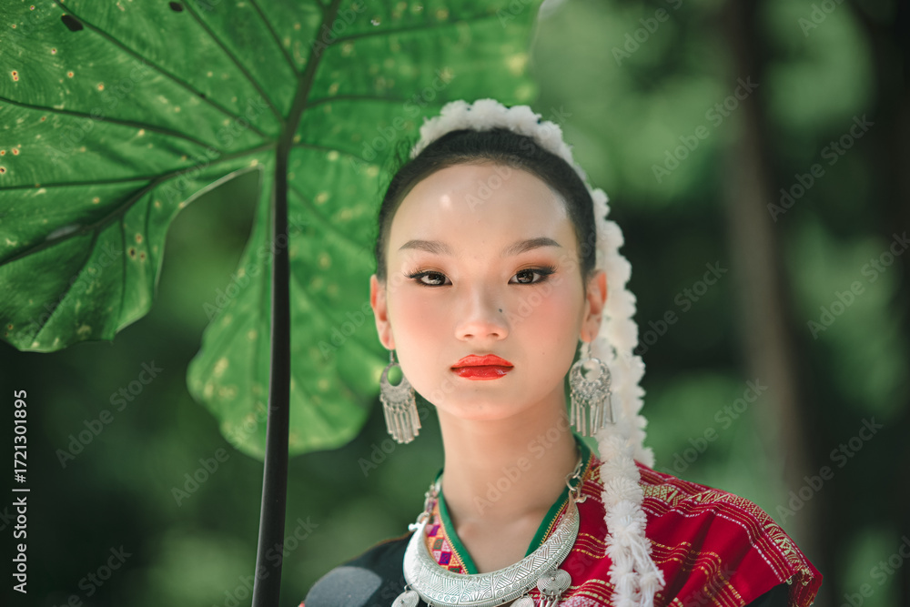 Portrait of a Woman in Traditional Attire with Large Leaf Prop