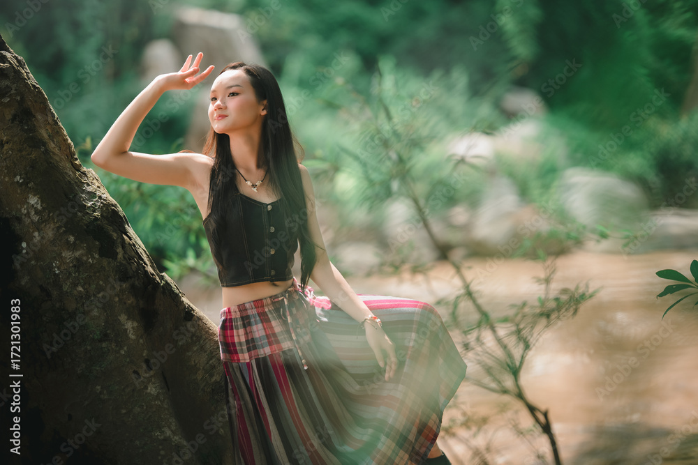 Young Woman Posing Gracefully in Nature with Flowing Skirt