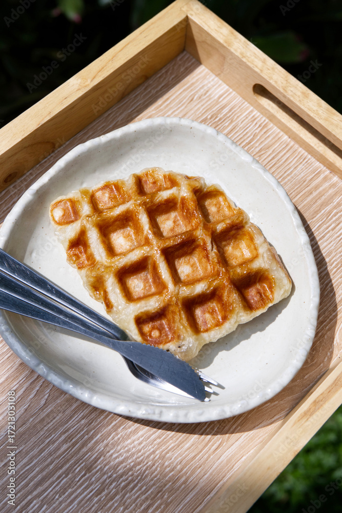 Croffle dessert on white plate with wooden tray for serving. Top view of croffle with fork and knife. Concept of dessert, natural light, vibe of sunny day, waffle, cafe, and eating sweet.