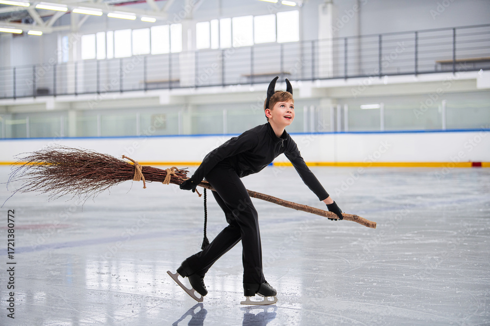 Young figure skater in a devil costume with a broomstick performing on the ice rink during Halloween