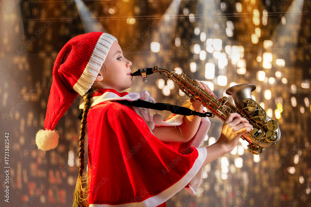 Girl child in red Christmas Santa hat playing saxophone in decorated hall. Christmas children music concept