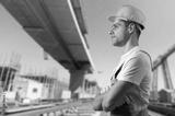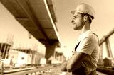 A construction worker posing at a building site.