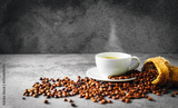 Coffee cup and coffee beans in sack on gray background, Espresso crema coffee cup aromatic
