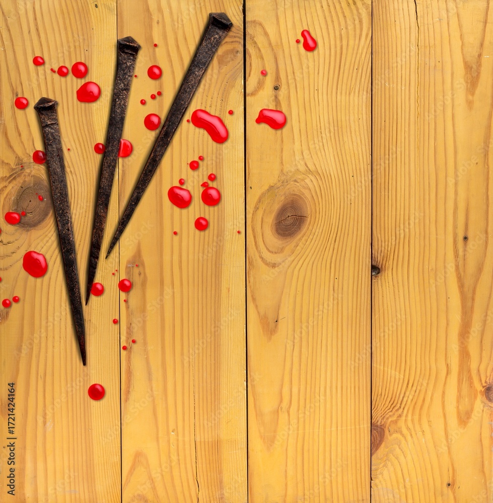 Christian rusty nails with drops of blood. Crucifixion.