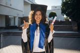 Feeling good, holding diploma. Cheerful graduate student in a gown is standing outdoors
