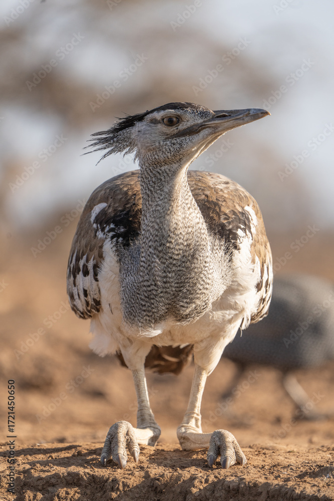 A kori bustard kneeling at the edge of a waterhole, looking to the side, Botswana.