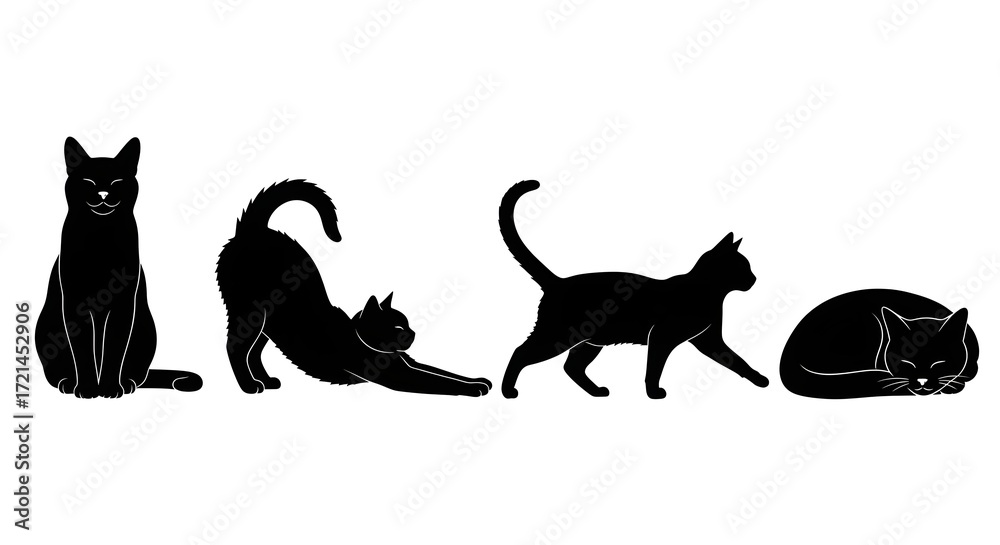 Silhouettes of a black cat in different poses isolated on white background