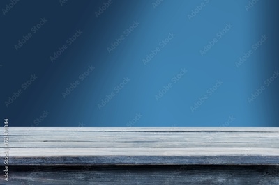 Empty wooden table top on dark blue wall.