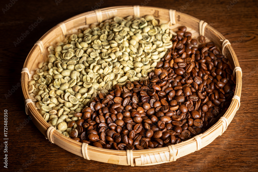 Roasted and raw coffee beans on a wicker tray