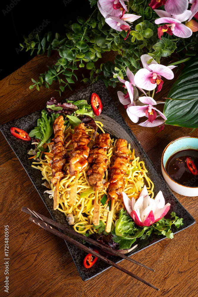 Asian Cuisine. Chicken Skewers on Wooden Skewers