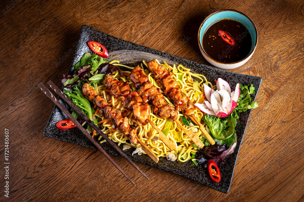 Asian Cuisine. Chicken Skewers on Wooden Skewers