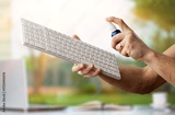 Cleaning service disinfects Technics from coronavirus, antiseptic processing computer.