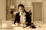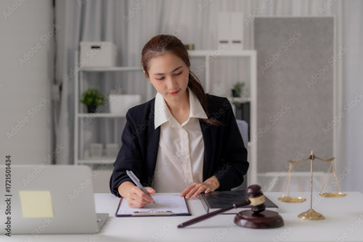 Asian Female Lawyer Drafting Legal Documents Law Firm Office Young Attorney Reviewing Contract Agreements Justice System Scales Gavel Courtroom Regulations