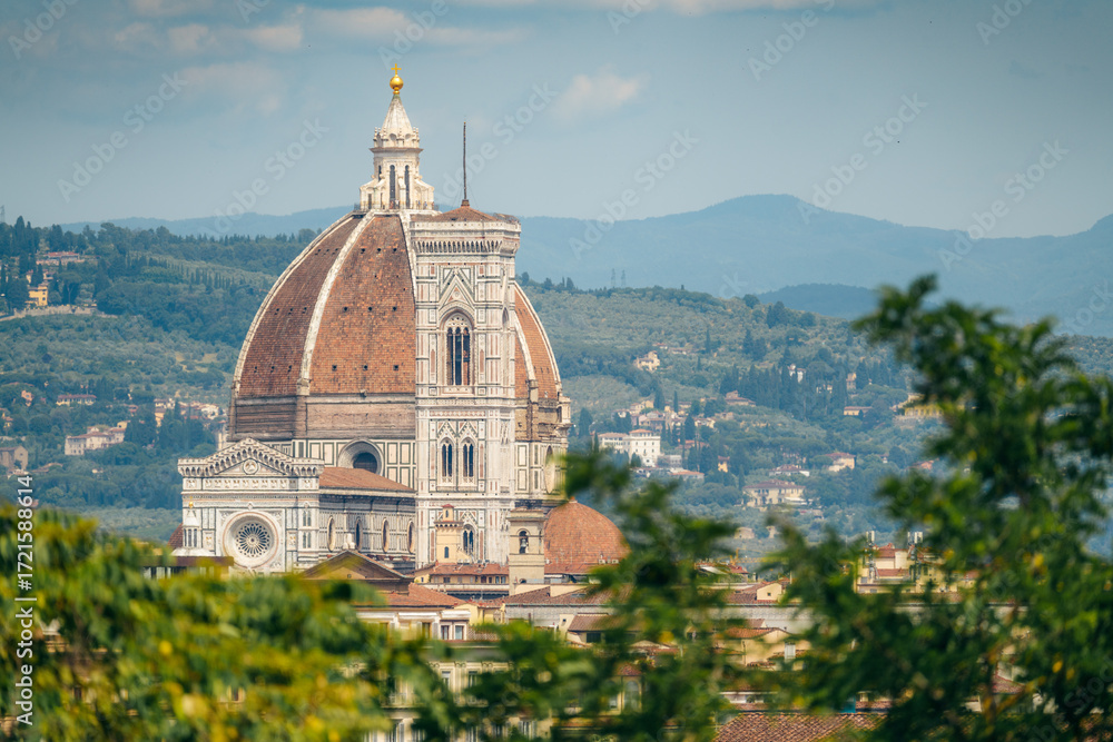 The Duomo of Florence, Italy, stands tall against a backdrop of rolling hills..