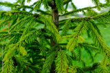 Background from young green fir-tree branches with small needles. Evergreen fir tree grow for publication, poster, screensaver, wallpaper, postcard, banner, cover, post. High quality photo