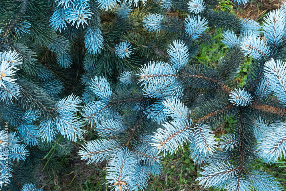 Close-Up of Blue Spruce Tree Foliage – Silvery-Blue Needles on Colorado Blue Spruce Branches in Garden Setting, Ideal Evergreen for Landscape Design, Windbreak, or Winter Interest
