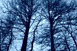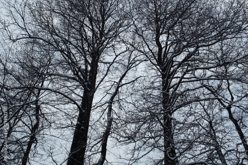 Winter Forest View Looking Up at Snow-Covered Bare Trees Against Pale Blue Sky - Serene Seasonal Nature Landscape with Tall Dark Trunks and Branches
