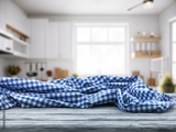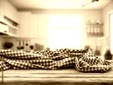 Empty wooden desk at kitchen background