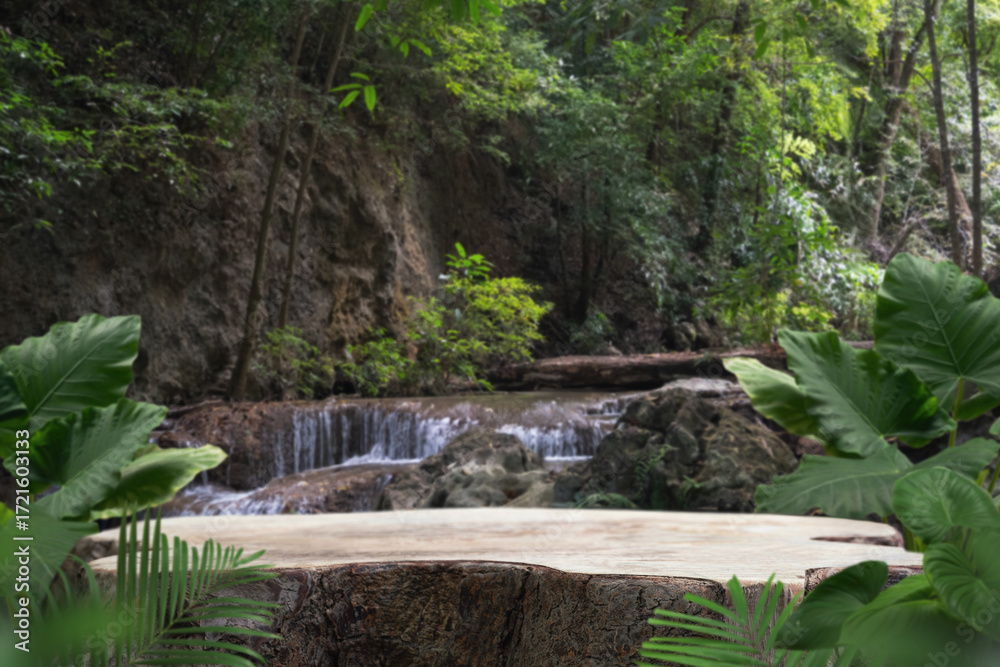wood stump table top podium with outdoor waterfall tropical forest nature background landscape.Natural water mineral product present placement pedestal wooden stand display.jungle paradise concept.