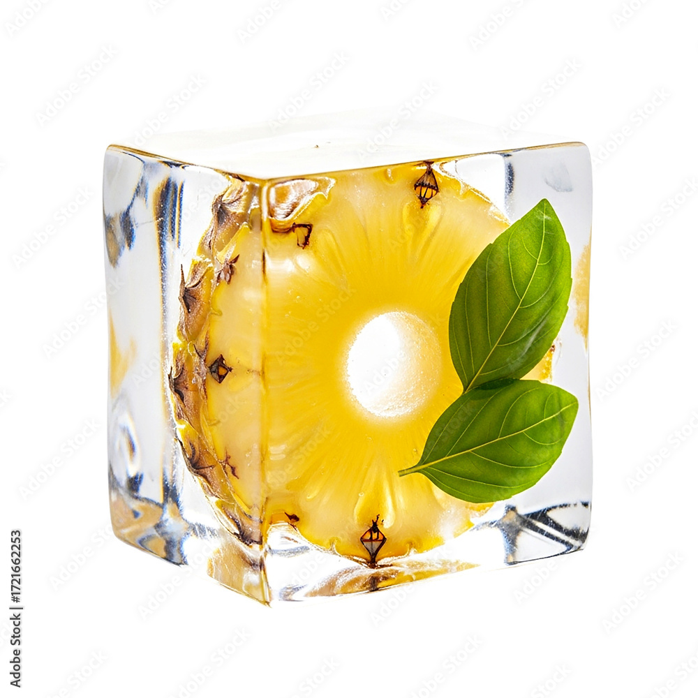 Tropical Refreshment Pineapple Slice Encased in Crystal Clear Ice with Fresh Basil Exquisite on transparent background