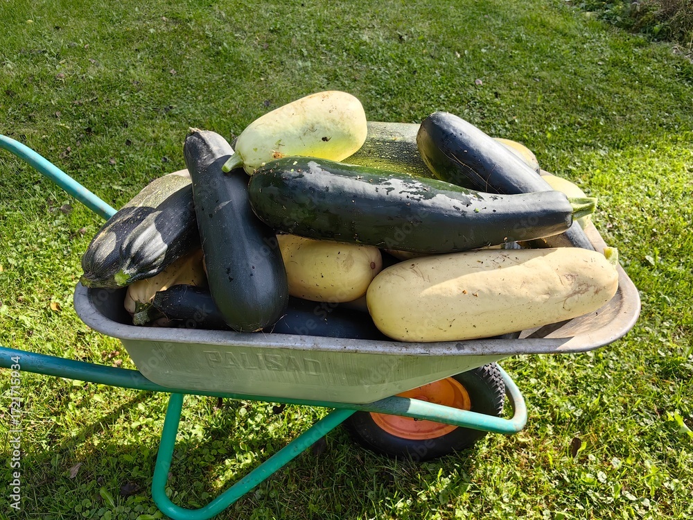 Tsukini crop is harvested in a cart in the garden in the fall. Useful vitamin vegetables for vegetarian nutrition.