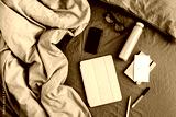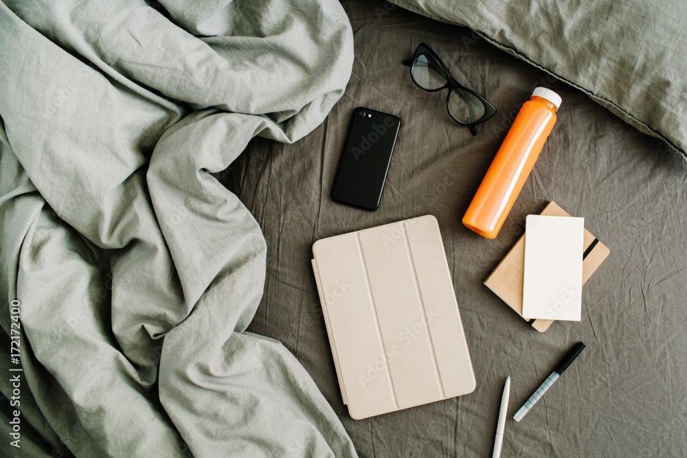 Tablet, diary, mobile, fresh juice, glasses in bed with grey sheet and pillows. Flat lay, top view home office background.