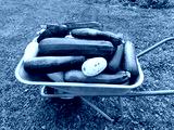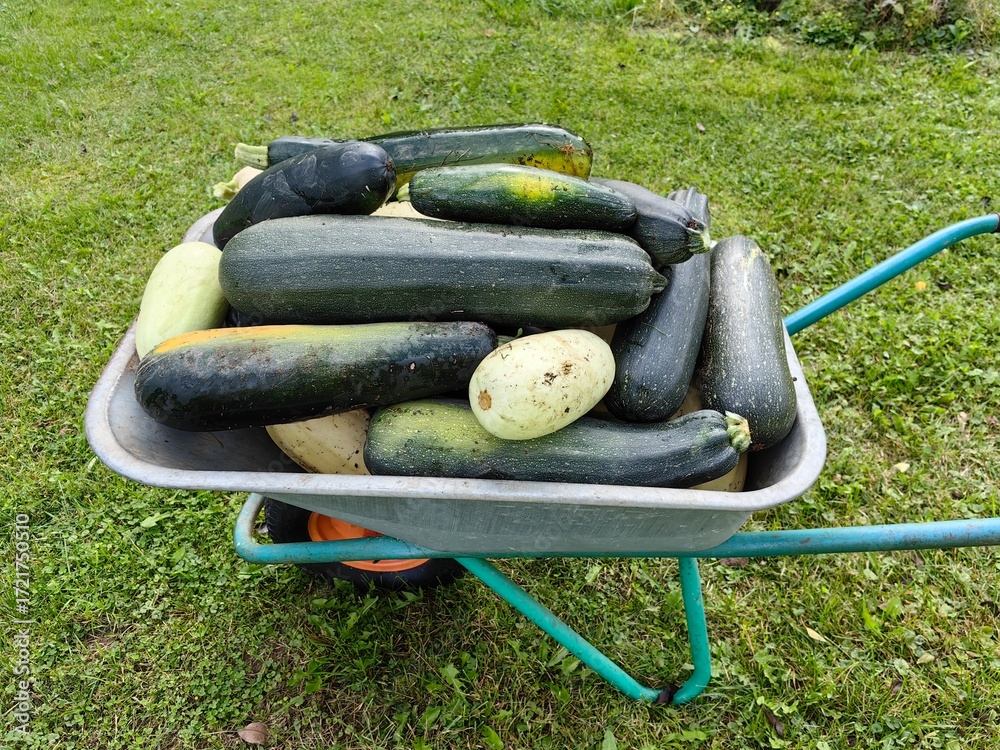 Tsukini crop is harvested in a cart in the garden in the fall. Useful vitamin vegetables for vegetarian nutrition.
