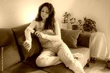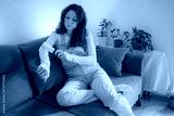Young woman relaxing on an orange sofa, using a lint roller to effortlessly remove pet hair from her sleeve while enjoying a cozy moment in her inviting living room
