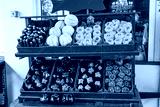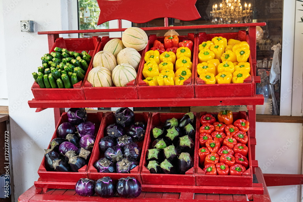 Fresh raw vegetables in boxes displayed outside market shop in a town in Europe. Top down, wide angle view, no people