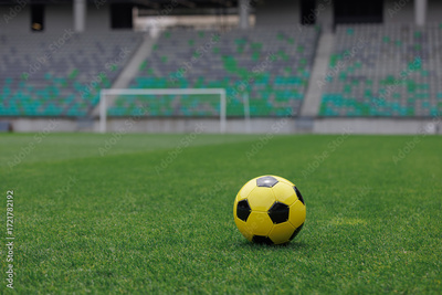 A bright yellow soccer ball rests on green grass inside a modern stadium, ready for play.