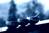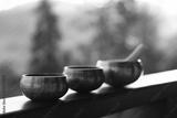 Tibetan singing bowls with mallet on handrail outdoors, closeup