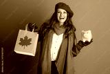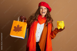 A cheerful woman in autumnal fashion, wearing beret and orange coat, smiles while holding shopping bags and yellow piggy bank. The image evokes themes of fall shopping, savings, and financial planning